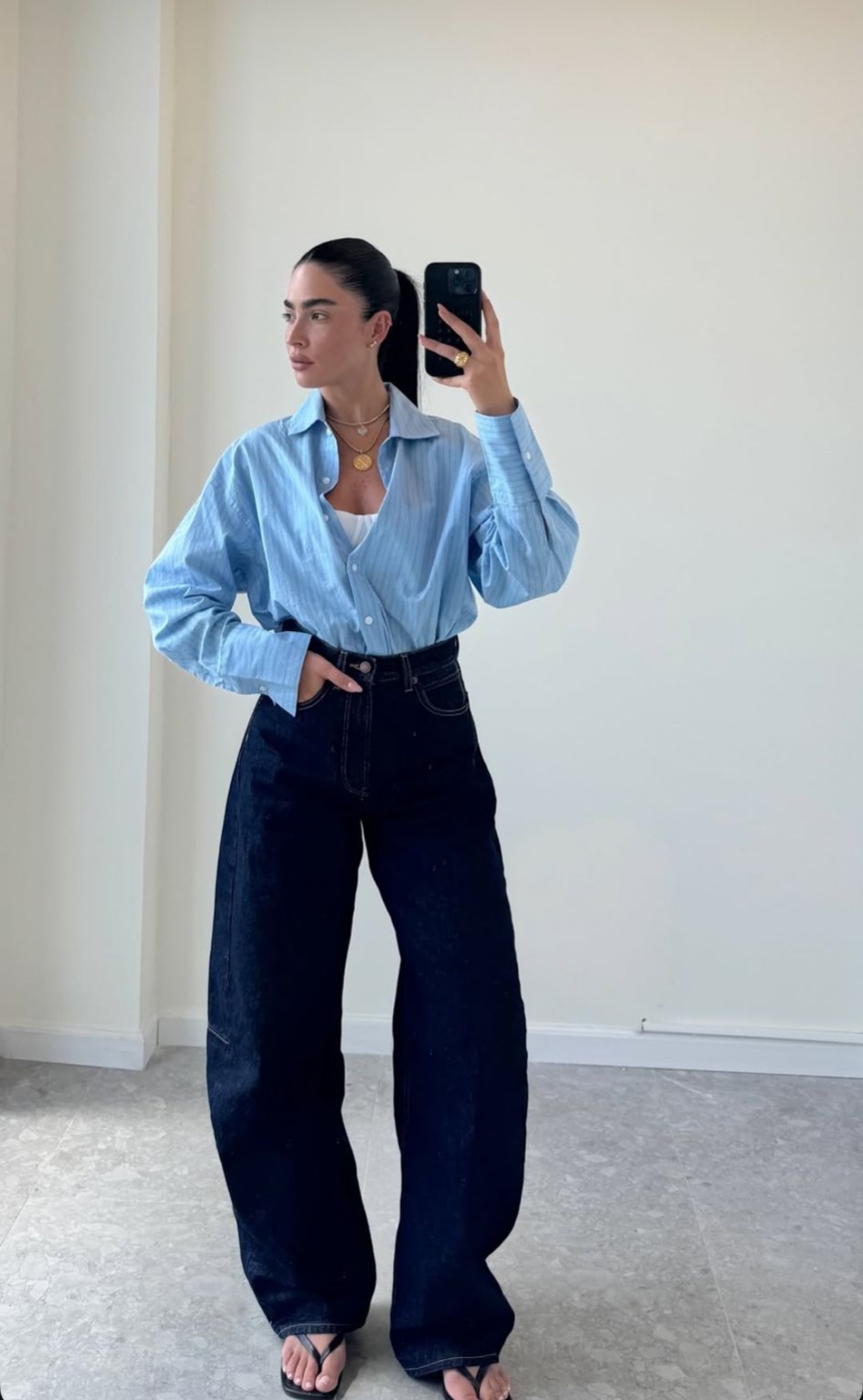 ספיר אביסרור יודעת דבר או שניים על הטרנדים החמים של הרגע, ובדיוק בגלל זה בחרה ג'ינס בגזרת חבית. היא עשתה נכון כשבחרה בשטיפה סתווית כהה, וכדי להקליל שידכה להם כפכפי אצבע. את החולצה מצאה דווקא במחלקת הפיג'מות וזה מפתיע והורס