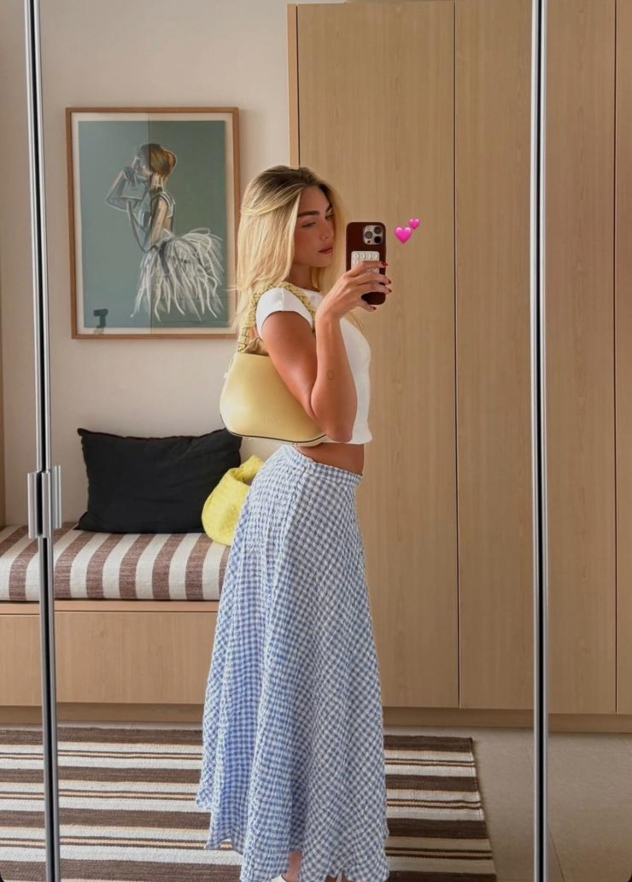 הסתיו בפתח אבל מאיה קיי נראית כמו קמפיין מושלם לקיץ. מאיה הלכה על טריו של כחול לבן וצהוב חמאה וזה כל כך יפה יחד. מדובר בחצאית פיקניק בכחול לבן שפשוט הורסת עליה במיוחד עם החולצה שהיא כאילו לבנה פשוטה אבל יש לה טוויסט מהמם בגב והתיק – הו התיק. מושלם לקיץ אבל יעבוד נפלא גם בחורף הישראלי