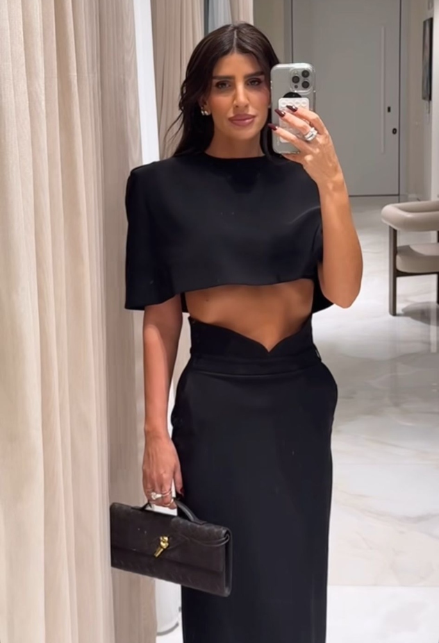 בחצאית מידי צמודה לגוף עם דיטייל ייחודי במותן ובשילוב טופ דמוי שכמיה עם כתפיים מודגשות, עינב בובליל התכוננה ליציאה עם חברות ולבשה לוק בעיצובה של חברתה הקרובה. אזור הבטן נשאר חשוף, מה שהדגיש את אזור כלוב הצלעות ויצר מראה סקסי ומלא בטחון. אין מה לומר, זה לוק שתפור עליה