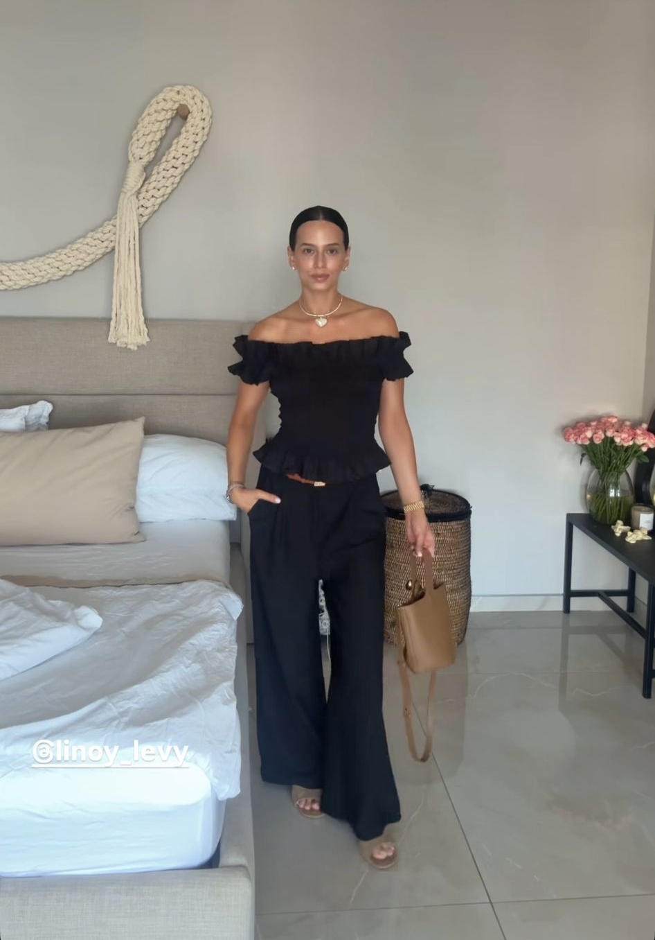 קורין גדעון מוכיחה שלפעמים לוק קלאסי שחור יכול להיות מאד מוצלח גם בימי הקיץ החמים. התאהבנו בחולצה הרומנטית שיש בה טוויסט, במכנסיים שמדיפים ניחוח שיק בלתי מתאמץ בעליל והשיא הוא השילוב בין הכפכפים, החגורה והתיק. פשוט אהבנו ביותר