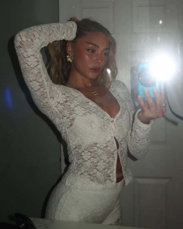מאיה בחרה במראה חגיגי, אבל גם סקסי, של מכנסיים וחולצה תואמים, שניהם עשויים תחרת פרחים אלסטית. התחרה המעט שקופה חושפת את העור, ולכן המכנסיים מגיעים עם בטנת מכנסונים. הסט אזל לחלוטין מהאתר בצבע לבן, ונותר במידות בודדות בצבע שחור.