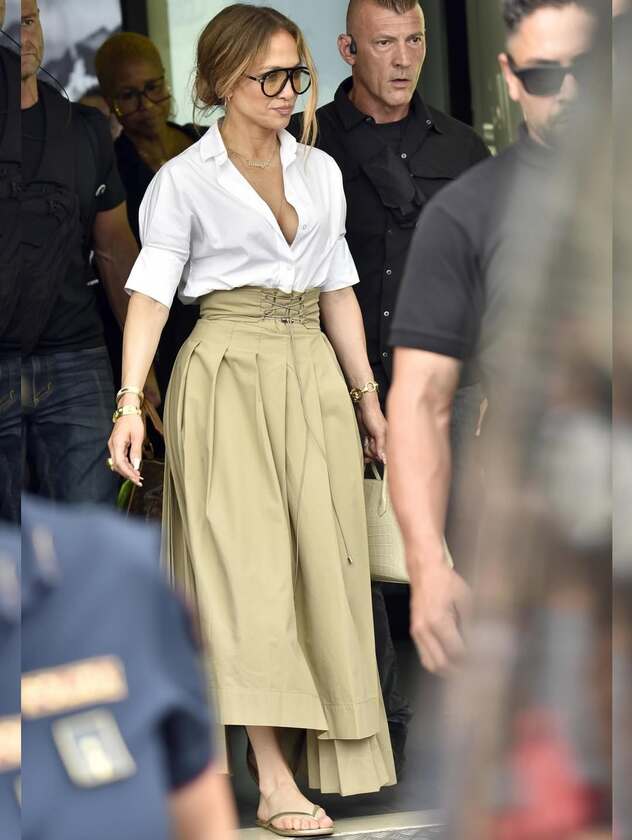 הלוק של ג'ניפר לופז בשדה התעופה באיטליה היה כל מה שלא היינו חושבים ללבוש לטיסה מתישה. מדובר בחצאית, חגורת מותן הדוקה, חולצה מכופתרת והשוס – כפכפים. לא מה שציפינו אבל אפשר בהחלט להגיד שהכל ביחד פשוט עובד לה