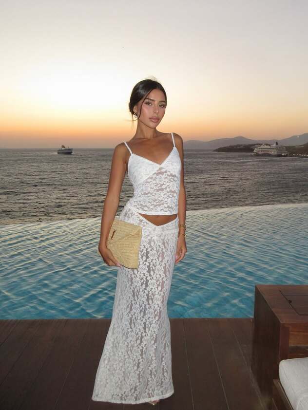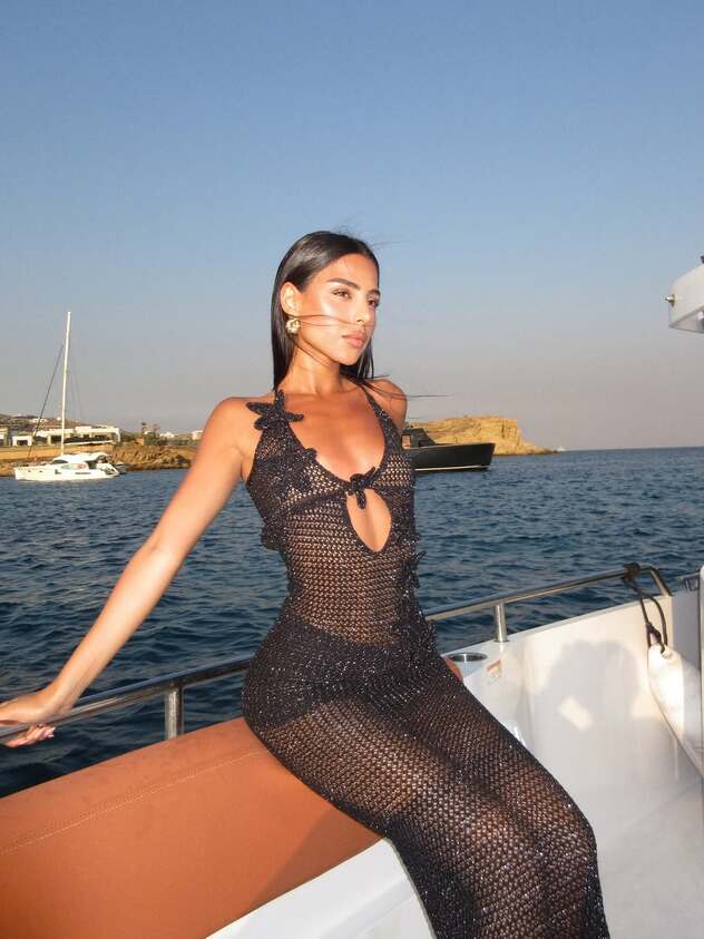 הפריט המטריף ביותר שהיא ארזה איתה היה שמלה מדגם Hilsa, שהיא שמלת מקסי שחורה מרשת סרוגה – מה שהופך אותה למושלמת ללבישה מעל בגד ים – עם אפליקציות פרחים ומחשוף גב עם קשירה. לוק נוסף של המותג שהיא לבשה הוא סט של גופייה וחצאית מתחרה לבנה, שמדגישה את השיזוף הקייצי.