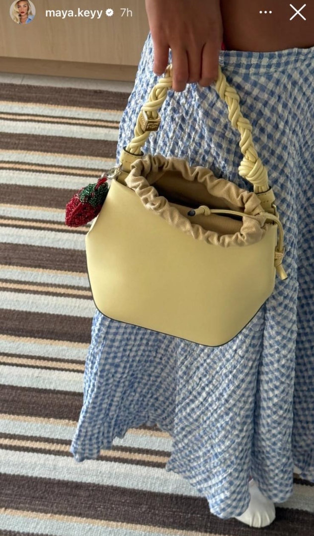 מדובר בחצאית באורך מידי בגזרה מתרחבת, שהטעינה את כל הלוק בווייב ׳פיקניקי׳ מתוק ותמים, ונתנה לו את הטוויסט הצבעוני הקסום עליו אנחנו מדברות. התיק של מאיה הוא מדגם ״בו״ האהוב, וקיי לא חסכה ושידכה לו צ׳ארם בצורת תות קטן.