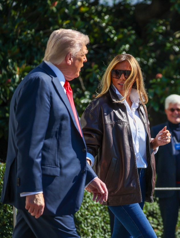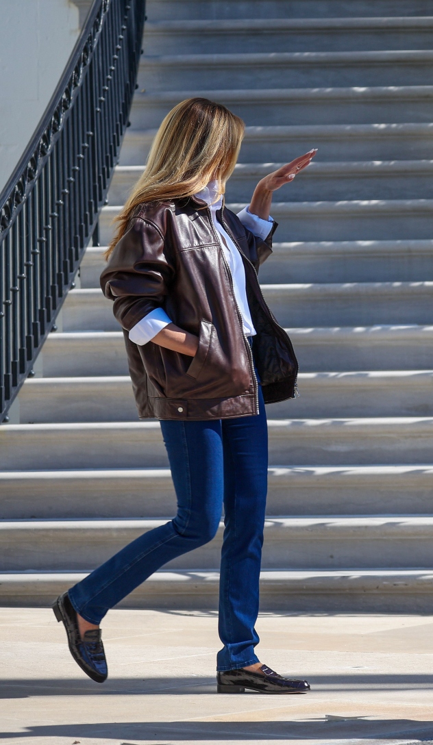 מלניה לקחה את אחד הפריטים הלוהטים של הרגע, ז'קט עור בגזרת Bomber, ונתנה לו פרשנות משלה, יחד עם חולצה לבנה מכופתרת, מכנסי ג'ינס בגזרת סקיני ונעלי לואפר.