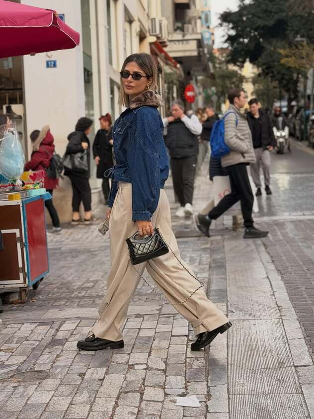 במהלך מסע שופינג אינטנסיבי באתונה, התעכבה מירן בוזגלו כדי לתעד את עצמה בלוק יפה במיוחד. הטוטאל לוק מורכב ממכנסיים מחויטים בגזרה רחבה ונמוכה בגוון בז', שלהם הוסיפה את פריט הקז'ואל האולטימטיבי – ז'קט ג'ינס. החיבור הזה יצר קונטרסט מוצלח, שהוא בול מה שיום של שוטטות צריך