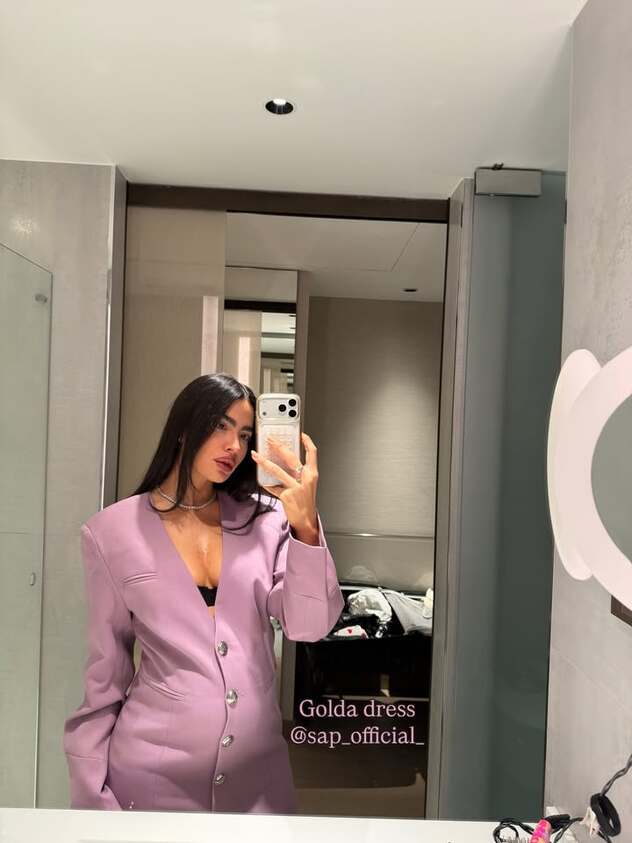 ואולי היציאה הצבעונית והמפתיעה ביותר של הנסיעה הייתה שמלת ז'קט בצבע סגלגל מהמותג שלה: דגם מיני שנלבש עם גרביונים שחורים, נעלי עקב גבוהות וחזייה סקסית שבצבצה בעדינות מלמטה. מדריד אולי קפואה – אבל ספיר בהחלט דאגה לחמם את האווירה.