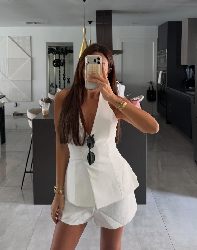 הפעם היא בחרה באאוטפיט שמדגיש היטב את השיזוף: טוטאל לוק לבן שמגיע מאחת הרשתות הוותיקות, אך מעט נשכחות – קוקאי. מדובר בטופ דמוי ווסט בגזרת קולר ומכנסיים לבנים קצרים.
