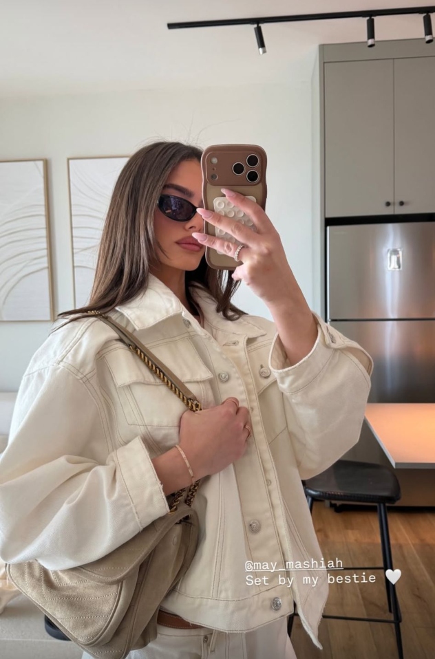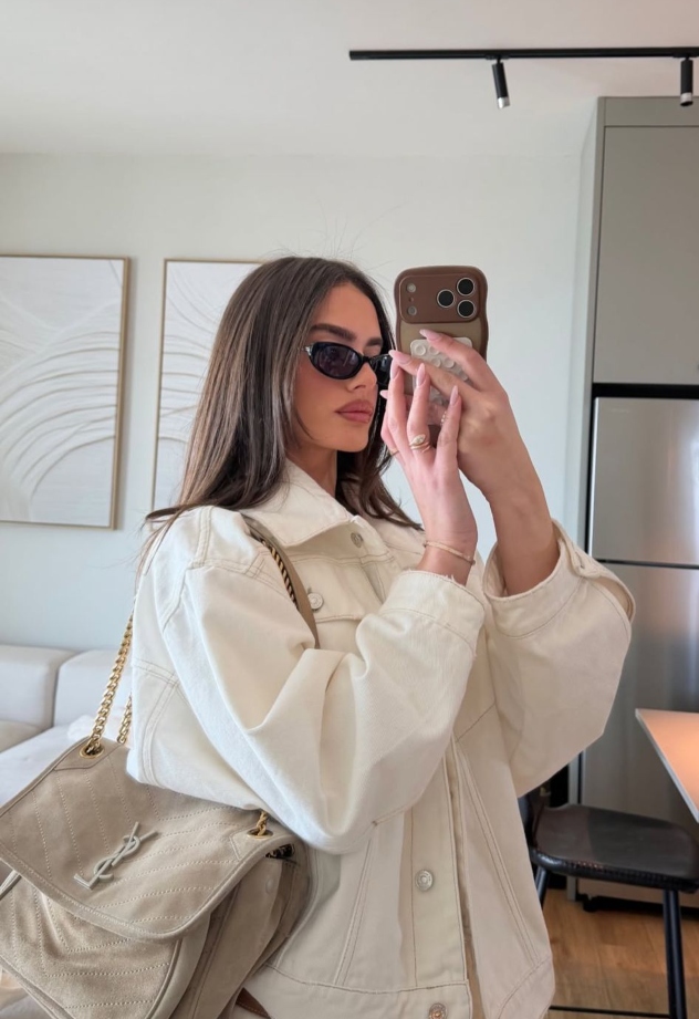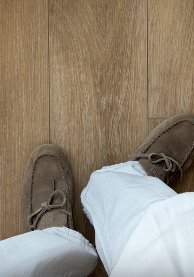 האביזרים שנבחרו ללוק היו מדויקים ונצמדו לחומריות של זמש בגוון חום: נעלי יאכטה עדינות של מיו מיו ותיק יד גדול של סן לורן. נראה שאם יש נוסחה מנצחת לעונת המעבר, שלביה הרגע פיצחה אותה עם שילוב מושלם בין יוקרה פריזאית לנינוחות ישראלית.