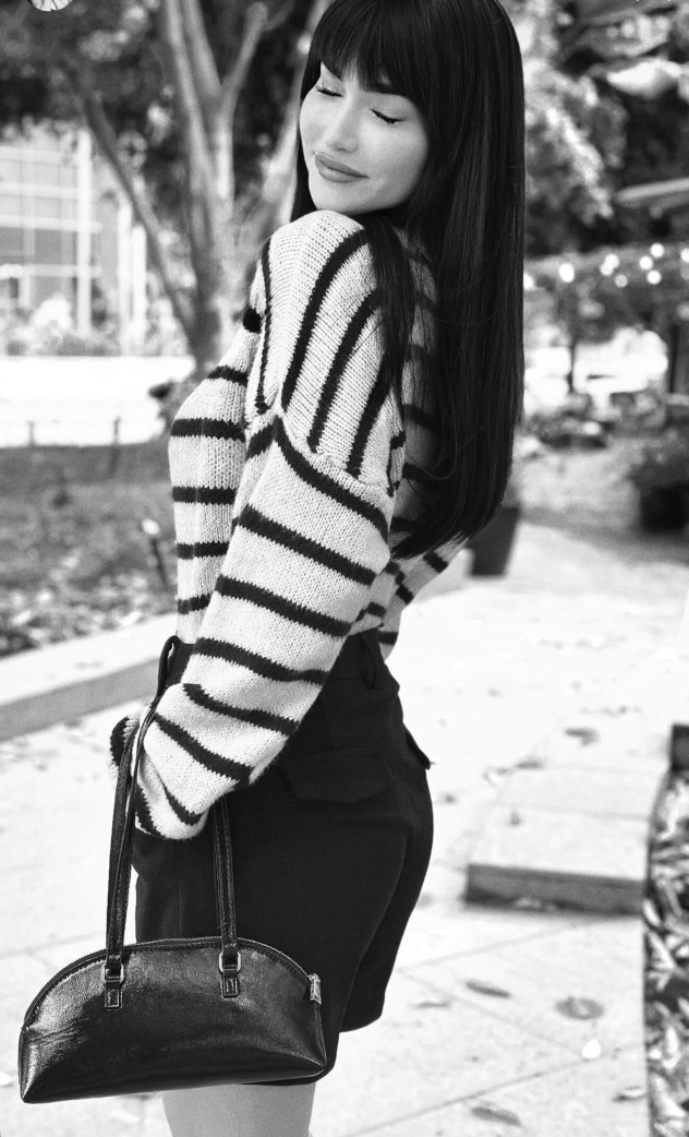 היא בחרה בשילוב לא שגרתי שמגלם את "משבר הזהות" של המלתחה בעונה הנוכחית: סריג פסים במראה חורפי ומחבק בחלק העליון, לעומת מכנסיים קצרים ורגליים חשופות בחלק התחתון.